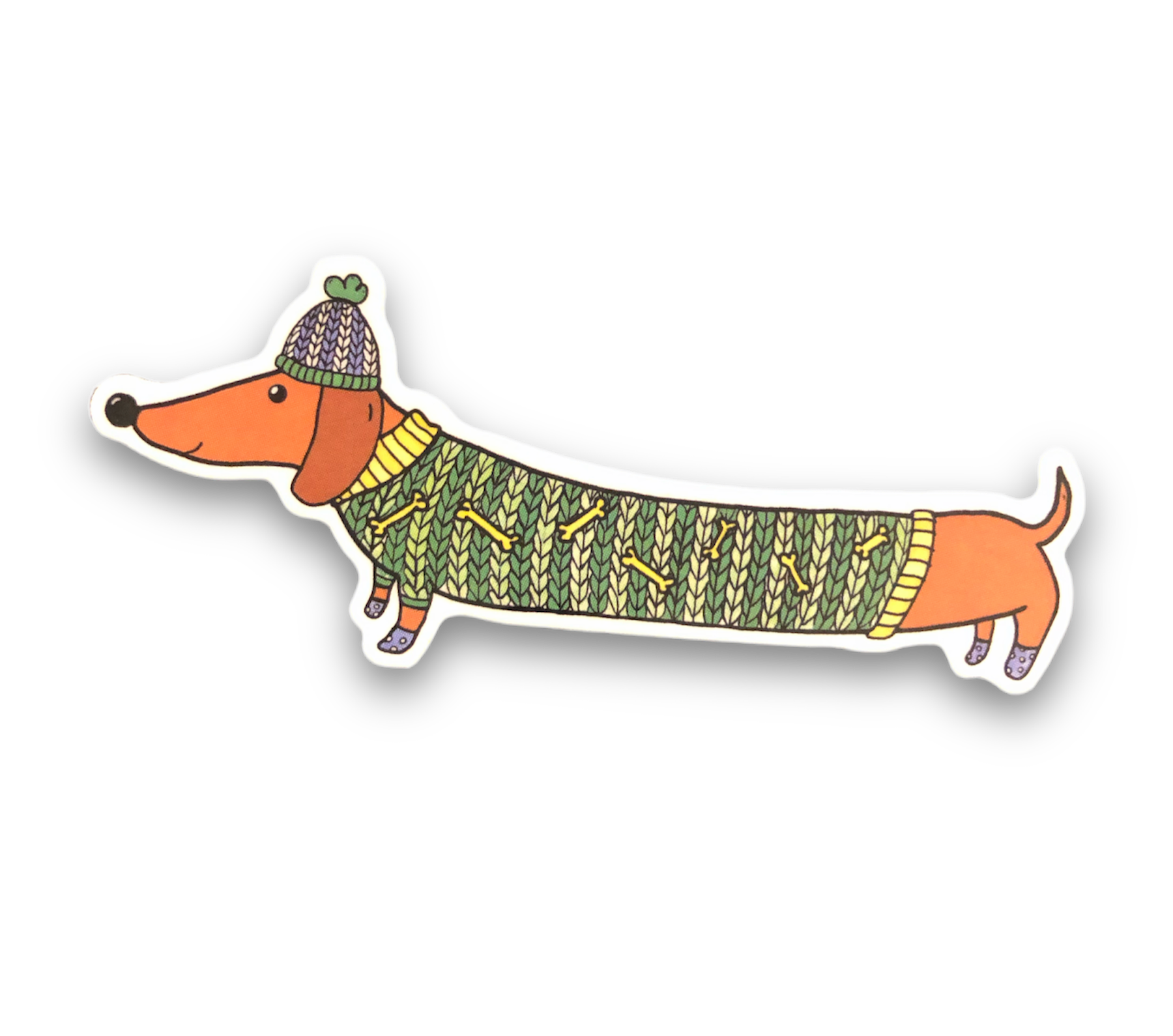 this cute and quirky sticker features a tiny dachshund dressed up in a cozy knit sweater and matching hat. it's an excellent way to add a touch of playful humour to your laptop, water bottle, or anywhere else you can think of.