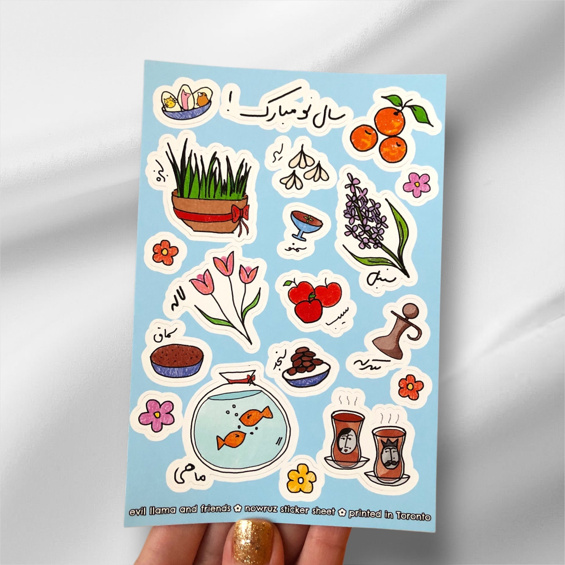 this cute sticker sheet has all the nowruz elements you need for your haft seen table, and more! packed with adorable and colourful illustrations of traditional persian and nowruz elements such as: